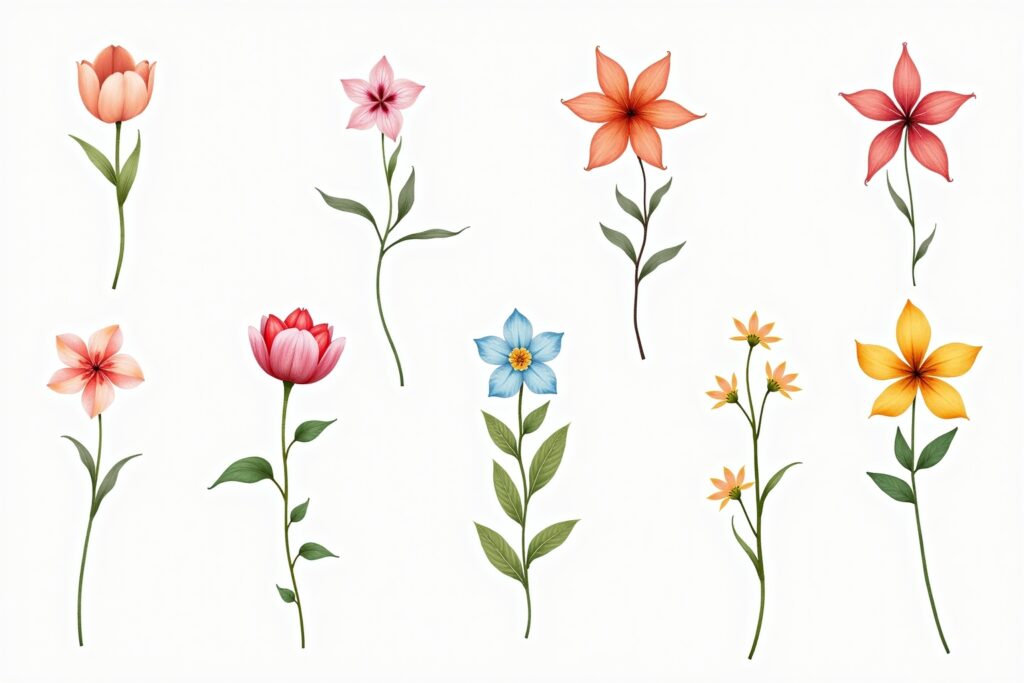 - Aquarellblumen: Die zarten Aquarellblumen verleihen deinen Designs eine verspielte und künstlerische Note. Sie eignen sich hervorragend für Einladungen, Wandbilder oder um deinem Bullet Journal einen individuellen Touch zu verleihen.