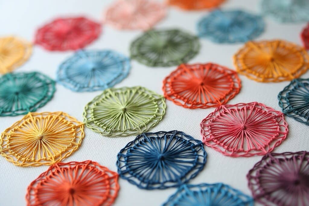 Das hängt von deinem persönlichen Geschmack und dem gewünschten Effekt ab. Dünnere Fäden wie Stickgarn oder Baumwollgarn eignen sich gut für filigrane Muster, während dickere Fäden wie Wolle oder Metallic-Garn für einen auffälligeren Look sorgen. Experimentiere mit verschiedenen Fadenstärken, um herauszufinden, was dir am besten gefällt.