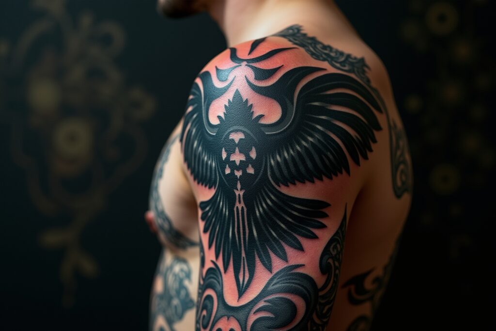 - Tribal/Nordisch: Diese Tattoos verwenden traditionelle nordische Muster und Symbole, um eine stilisierte Darstellung von Odin zu schaffen. Sie sind oft in Schwarz und Grau gehalten und haben einen starken Bezug zur nordischen Kultur.